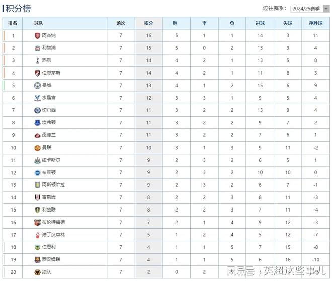昨晚今晨,英超联赛第7轮全部战罢,曼城客场1-0击败布伦特福德,升至积分榜第5位,哈兰德打进唯一入球,罗德里因伤下场,曼城连续7场比赛不败;纽卡斯尔主场2-0击败诺丁汉森林,沃尔特马德连场进球;水晶宫客场1-2输给埃弗顿,各项赛事19场不败遭终结,曼城租将格拉利什打进绝杀。曼城客场1-0击败水晶宫,连续4轮不败抢到10分。开场仅9分钟,曼城后场送出过顶球,哈兰德强吃后卫后劲射破门,帮助曼城取得梦幻开局;第20分钟,中场大将罗德里因伤无法坚持,被尼科冈萨雷斯换下;下半场多纳鲁马力拒对方前锋伊戈尔单刀球,但是也有一次开大脚差点被挡进自家球门,最终曼城有惊无险地客场拿下胜利。水晶宫客场1-2输给埃弗顿,本赛季不败金身告破。上半场水晶宫的机会不少,第38分钟,萨尔反击中分球到右路,穆尼奥斯推射破门,先拔头筹;下半场埃弗顿全力进攻,第76分钟,伊罗格布南被犯规赢得点球,恩迪亚耶主罚命中扳平比分;第92分钟,埃弗顿右路传中制造混乱,格拉利什补射破门,打进绝杀,水晶宫各项赛事19场不败纪录被终结,英超已经没有不败的球队。其他比赛中,纽卡斯尔主场2-0击败诺丁汉森林,吉马良斯轰世界波,沃尔特马德点射破门;狼队主场1-1战平布莱顿,新赛季在联赛仍未能赢球;阿斯顿维拉主场2-1击败伯恩利,取得各项赛事4连胜,马伦梅开二度。