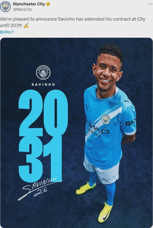 官方:曼城宣布和萨维尼奥续约到了2031年。21岁的萨维尼奥今夏曾和热刺联系在一起,不过曼城拒绝放人,而这名新星现在签下了一份新的长期合同,锁定了他的未来。