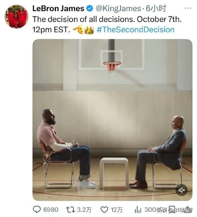 10月7日凌晨,湖人老大詹姆斯突然更新了推特动态,他写道:“所有决定中的决定,10月7日,美东时间中午12点。#决定2”换算成北京时间即明天凌晨0点。而在15年前,詹姆斯做出的“决定1”,就是离开克利夫兰骑士,将天赋带到西海岸的迈阿密热火。