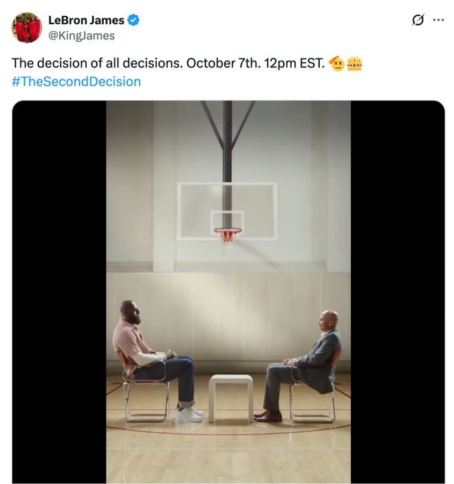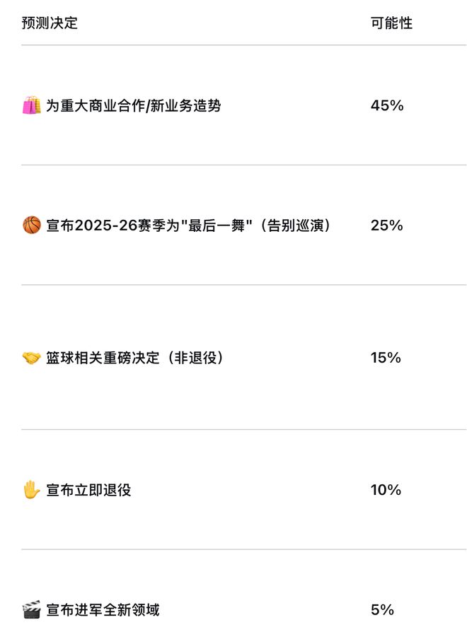 10月7日,NBA洛杉矶湖人巨星勒布朗·詹姆斯在社交媒体发布了一个名为“第二次决定”的短视频。“第二次决定”将在北京时间10月8日0点正式对外公布。该动态一经发布,外界纷纷猜测詹姆斯届时或许将宣布他会在2025-2026赛季结束后退役。我们决定询问DeepSeek以下是DeepSeek给出的预测AI给出的原因如下:商业优先:最大的可能性依然指向商业行为。勒布朗早已超越了一名纯粹运动员的范畴,他是一个品牌、一位企业家。将个人重大生涯节点的预告与商业活动绑定,能产生1+1>2的传播效果,这非常符合他团队的运营策略。“最后一舞”的智慧:直接退役的可能性被高估。对于勒布朗这样级别的传奇,一个事先张扬的、为期一整季的“告别巡演”不仅能满足球迷的情感需求,更能带来巨大的经济效益,同时为他退役后的“商业帝国”铺平道路。这远比突然退役更具“勒布朗风格”。为未来布局:即使决定与篮球直接相关,也可能不仅仅是“打或不打”。更可能是关于权力、所有权和传承的声明,例如明确表达成为NBA球队老板的意图,或公开为儿子的职业生涯搭建平台。历史复刻的意图:詹姆斯特意穿上2010年"决定一"时的同款衬衫,这种强烈的符号化行为,目的更像是为了引发全民讨论和关注,为后续的官宣积累巨大流量。这种操作模式与重大商业宣传的逻辑更为吻合。时机的选择:宣布日期与亚马逊Prime会员日完全重合。对于詹姆斯这样拥有庞大商业版图的运动员来说,利用个人品牌的影响力为商业合作伙伴造势,是一个合理性很高的解释。总而言之,考虑到勒布朗·詹姆斯的历史、其团队的运作模式以及宣布时机的高度巧合,这更像是一次将个人品牌、商业利益和职业生涯规划完美融合的战略性公告,而非一个单纯的篮球决定。巨大的悬念之下,洛杉矶湖人队2025-26 赛季常规赛最后一场主场比赛的门票价格因此暴涨。在詹姆斯发布这个动态之前,2026 年4月12日湖人主场对阵犹他爵士队的比赛,最便宜门票为82美元。动态发布后,票价瞬间飙升,单张票价为每张580美元起。可能大家熬夜等,等到最后……但等还是要等的……让我们静待答案揭晓大家在等待0点官宣前,五星体育也为您贴心准备了福利。扫描下方二维码,即可参与抽奖:✅ NBA运动套装✅ NBA官方篮球✅ 《看东方》APP会员月卡 (随时随地,畅享NBA比赛直播)文中部分预测及分析来源:DeepSeek