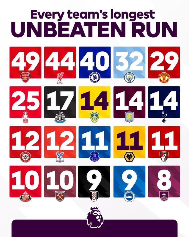 在本赛季英超已无开局不败球队后,英超官方列出了本赛季英超20支球队各自的最长英超不败纪录。英超20队各自最长不败排行1. 阿森纳 49场2. 利物浦 44场3. 切尔西 40场4. 曼城 32场5. 曼联 29场6. 诺丁汉森林 25场7. 纽卡斯尔联 17场8. 利兹联 14场8. 阿斯顿维拉 14场8. 托特纳姆热刺 14场11. 布伦特福德 12场11. 水晶宫 12场13. 埃弗顿 11场13. 狼队 11场13. 伯恩茅斯 11场16. 桑德兰 10场17. 西汉姆联 10场18. 富勒姆 9场18. 布莱顿 9场20. 伯恩利 8场【上咪咕独家看英超】