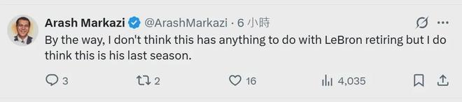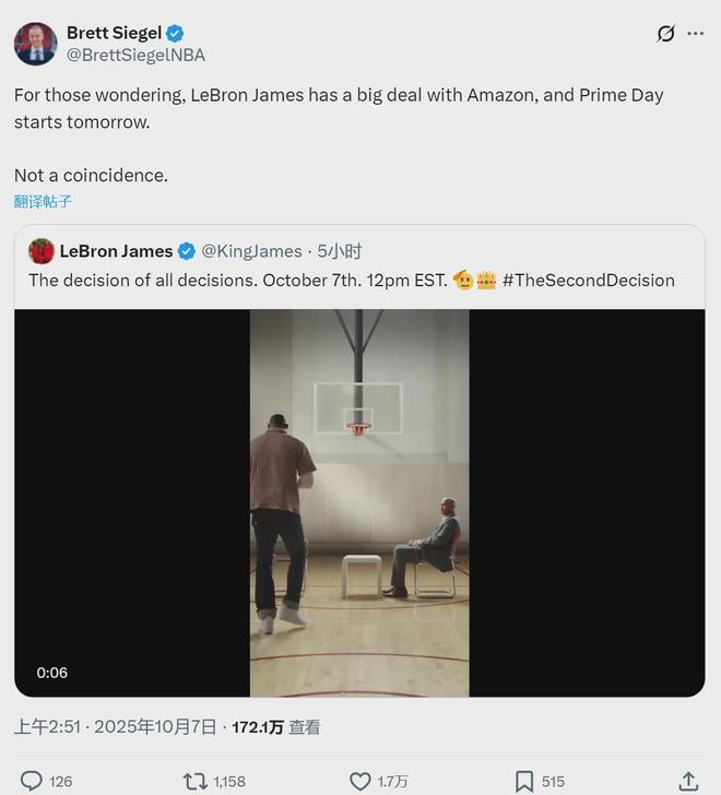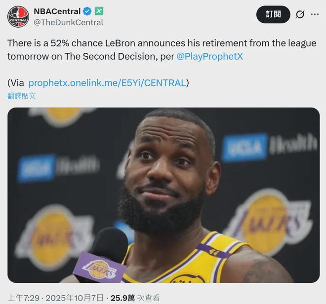 无论外界怎么评价,好还是坏,詹姆斯在篮球圈的影响力都是顶级的,随便说一句话都得被热议,被各种分析。今天,詹姆斯又说话了。詹姆斯在今天突然更新了个人社媒账号,如此写道:“所有决定中的决定,10月7日,美国东部时间中午12点。”换算过来,就是北京时间10月8日凌晨0点,今晚就能知道了。需要注意的是,詹姆斯在这个视频里穿的衣服,看上去跟2010年“决定一”时候用的一样。老詹也是够节省的啊,他这个身价的人不仅出门上网要找wifi,一件衣服也是用了15年都没舍得扔。当然,詹姆斯更大的可能是在表达,这个决定又能够轰动整个NBA,就跟2010年宣布加盟热火时一样。而且视频的结尾,也是写明了,就是“决定二”。15年过去了,詹姆斯拿过总冠军,离开骑士又回到骑士,直到再次告别克利夫兰,转战湖人,这一回又来一个“决定”,会是退役的决定吗?詹姆斯,会迎来一个退役巡演的赛季吗?令篮君意外的是,NBA圈内似乎并没有一个准确的答案或者风向,大家都不知道詹姆斯想干嘛。灰熊核心后卫莫兰特连续评论“不”和“他们说你骗人”,他预感詹姆斯是在预告退役时间。湖人前锋范德比尔特也出现在了这则视频的评论区,写道:“这是什么意思?”所以,连湖人球员也是一脸懵。作为詹姆斯的多年好友和前队友,每次碰面都要大力拥抱詹姆斯的乐福则拿出一张乔丹于2003年在奇才举行退役仪式的视频,开玩笑写了“决定二”。或许,乐福知道些什么?无论大家如何猜测,美国篮球圈已经炸了锅,湖人下赛季最后一个主场的比赛球票价格飙升,而且跟科比退役那年一样,也是主场对阵爵士。詹姆斯发了这则消息后,那场比赛的最低票价从85美元飙升到了445美元,目测还有提升空间,只要詹姆斯宣布这就是他最后一个赛季。对此,美国顶级体育预测市场Prophet X做出了判断,他们预测詹姆斯在今天凌晨宣布退役消息的概率为52%。篮君也不知道这个比率是怎么算出来的。不过Clutch Points的记者Brett Siegel给了另一种说法:“詹姆斯跟亚马逊签了一份大合同,Prime会员日则在明天开始,这绝非偶然。”此外,湖人跟队记者Arash Markazi表示,他始终认为这次预告与退役无关,“但我确实觉得这会是詹姆斯的最后一个赛季”。另一个湖人跟队记者Daniel Starkand则表示,他个人倾向于是商业合作,“毕竟这种套路我们见过太多了,我觉得勒布朗自己也明白这点,他的商业伙伴更清楚,所以我认为他多少有点在和我们玩心理游戏,最终这很可能是个品牌合作(很多人猜测是亚马逊)”。无论如何,詹姆斯的这件事都已经引发了轰动,他的合同也似乎在说明这一点。目前詹姆斯跟湖人的合同还剩下最后一年5262万美元,在2026年夏天到期,他也没有在今夏跟湖人完成续约。湖人总经理佩林卡在9月底的新闻发布会上也表态,称球队会给予詹姆斯和他家庭最大的尊重,“让他自己决定还想打多久,继续书写自己的故事”。因此,詹姆斯目前的命运应该是完全掌握在自己手里了。挺突然的,但是尊重詹姆斯的决定!