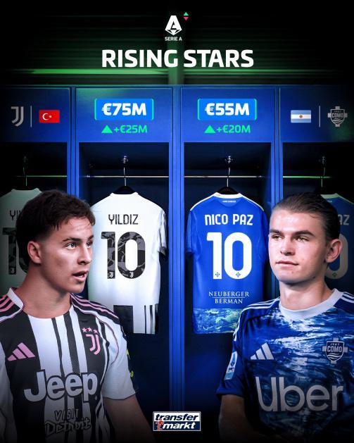 雷速体育10月7日讯 德国转会市场今日更新意甲联赛球员身价:尤文前锋伊尔迪兹身价涨幅高达2500万欧,身价来到7500万欧排名意甲第三;国米前锋劳塔罗身价下降1000万欧,但仍以8500万欧排名意甲榜首;科莫小将尼科·帕斯涨至5500万欧,排名意甲第8。意甲球员德转身价最新TOP101.劳塔罗(国米):8500万欧,下降1000万欧2.巴斯托尼(国米):8000万欧,不变3.伊尔迪兹(尤文):7500万欧,上涨2500万欧3.马库斯·图拉姆(国米):7500万欧,不变5.莱奥(AC米兰):7000万欧,下降500万欧6.巴雷拉(国米):6500万欧,下降1000万欧7.普利西奇(AC米兰):6000万欧,上涨1000万欧8.尼科·帕斯(科莫):5500万欧,上涨2000万欧9.科内(罗马):5000万欧,上涨1000万欧9.迪马尔科(国米):5000万欧,下降1000万欧9.基恩(佛罗伦萨):5000万欧,上涨1000万欧9.麦克托米奈(那不勒斯):5000万欧,上涨1000万欧9.布翁焦尔诺(那不勒斯):5000万欧,上涨500万欧9.布雷默(尤文):5000万欧,不变 伊尔迪兹以2500万欧涨幅成为此次身价涨幅最高的意甲球员,尼科·帕斯以2000万欧位列次席。而在身价下跌方面,今夏闹转会失败的亚特兰大前锋卢克曼下跌至4000万欧,跌幅为2000万欧,成为跌幅最大的意甲球员。