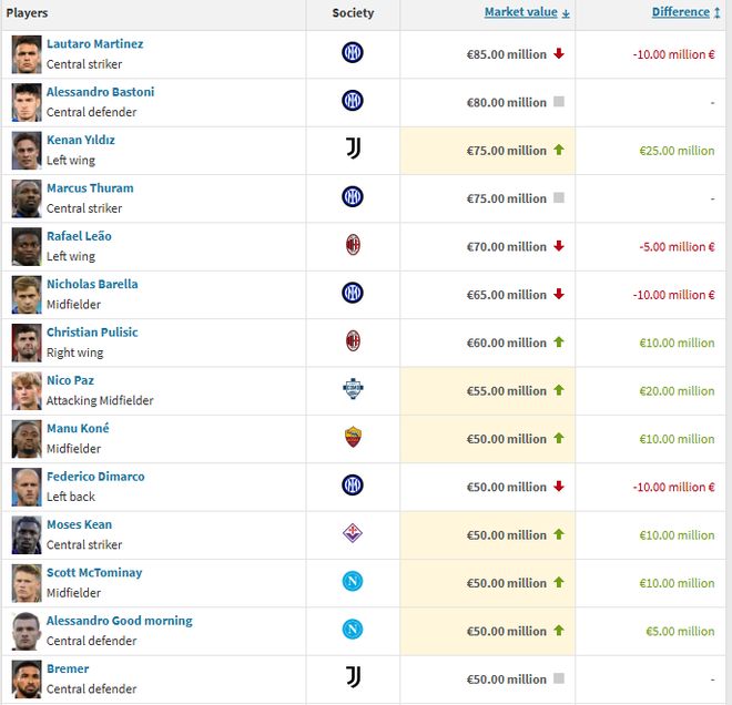 意甲德转身价更新:劳塔罗8500万欧第一,伊尔迪兹涨至7500万欧