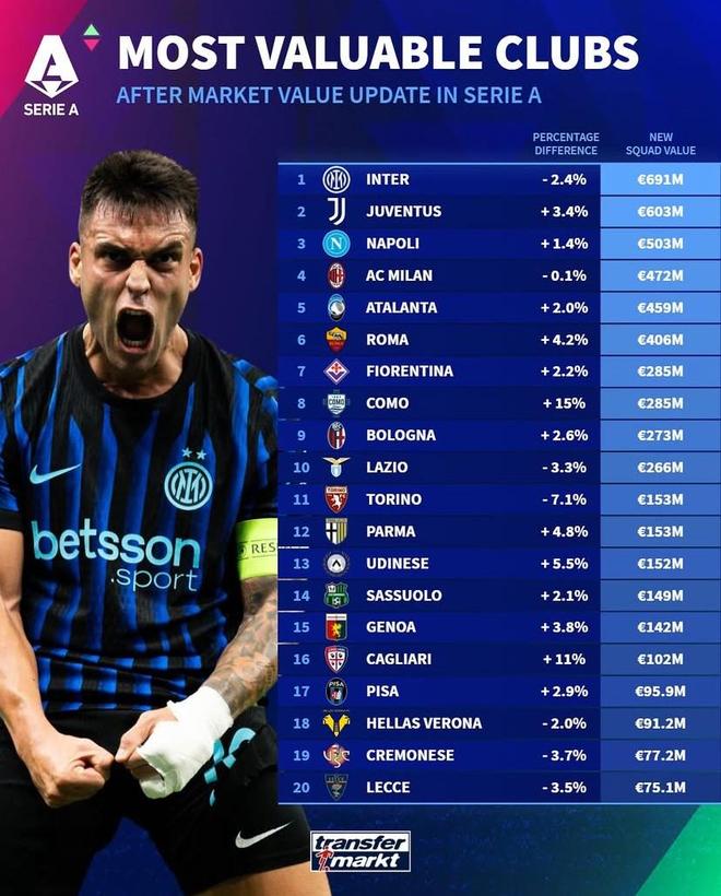 北京时间10月7日,在更新了意甲球员的身价之后,德转还列出了此次更新后意甲俱乐部总身价的涨幅情况以及具体排名,国际米兰以6.91亿欧元排名第一,随后分别是尤文图斯、那不勒斯以及AC米兰。德转更新后意甲俱乐部球员总身价排名:1. 国际米兰 6.91亿欧元(-2.4%)2. 尤文图斯 6.03亿欧元(+3.4%)3. 那不勒斯 5.03亿欧元(+1.4%)4. AC米兰 4.72亿欧元(-0.1%)5. 亚特兰大 4.59亿欧元(+2.0%)6. 罗马 4.06亿欧元(+4.2%)7. 佛罗伦萨 2.85亿欧元(+2.2%)8. 科莫 2.85亿欧元(+15%)9. 博洛尼亚 2.73亿欧元(+2.6%)10. 拉齐奥 2.66亿欧元(-3.3%)11. 都灵 1.53亿欧元(-7.1%)12. 帕尔马 1.53亿欧元(+4.8%)13. 乌迪内斯 1.52亿欧元(+5.5%)14. 萨索洛 1.49亿欧元(+2.1%)15. 热那亚 1.42亿欧元(+3.8%)16. 卡利亚里 1.02亿欧元(+11%)17. 比萨 9590万欧元(+2.9%)18. 维罗纳 9120万欧元(-2.0%)19. 克雷莫内塞 7720万欧元(-3.7%)20. 莱切 7510万欧元(-3.5%)