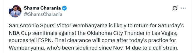 文班亚马因11月15日遭遇的左小腿拉伤,缺席了球队过去的12场比赛。不过本周有消息称,他的伤势已进入恢复的最后阶段。他已重返训练场,并且参与了多组五对五对抗训练。在周四球队夺得NBA杯四分之一决赛胜利后,当被问及文班亚马是否有可能在决赛中回归时,主教练米奇-约翰逊回应道:“可能性很大。”